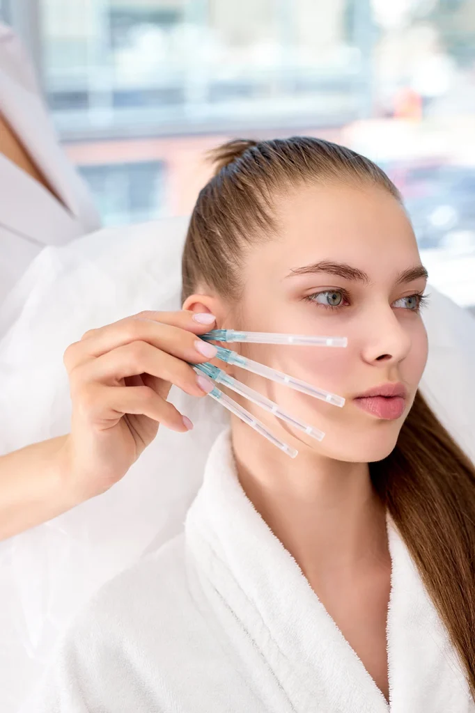 COG threads, or barbed threads, differ from other mesothreads in their structure; the small barbs contained in the threads adhere to the tissue, effectively lifting and supporting it. This allows them to achieve a so-called knife-free facelift. The threads typically dissolve within six months at the latest, but the collagen-stimulating effect they trigger continues for over a year.